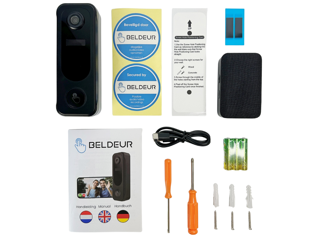 De deurbel is extra beveiligd tegen diefstal met een speciale beveiligingsschroef die aan de bovenkant van de deurbel is geplaatst. Deze schroef voorkomt dat de deurbel eenvoudig kan worden verwijderd. Om de deurbel toch los te halen, wordt er een speciale tool meegeleverd waarmee je de schroef veilig en eenvoudig kunt losdraaien. Dit zorgt voor maximale bescherming en gebruiksgemak.